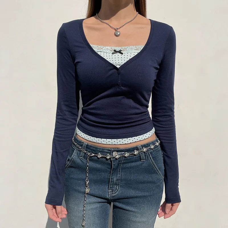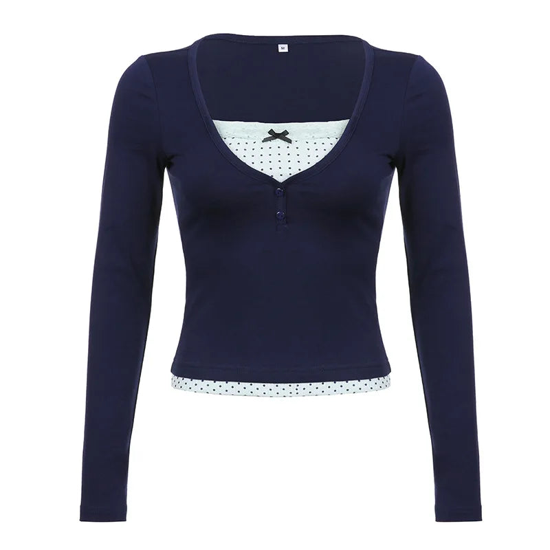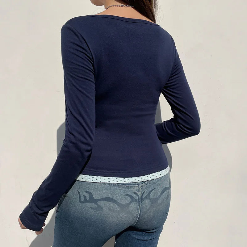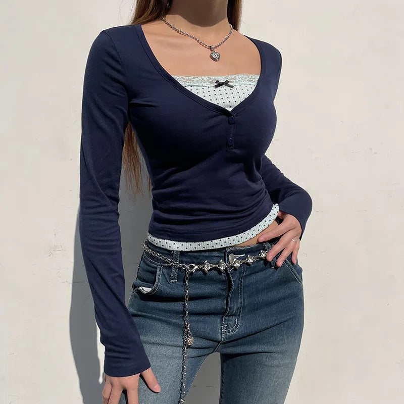 A long sleeve patchwork crop top blends playful and chic elements seamlessly. Crafted with various fabric patches in contrasting colors or patterns, it offers a unique and eclectic style. The cropped silhouette adds a modern twist, making it perfect for pairing with high-waisted bottoms for a trendy, fashion-forward look.